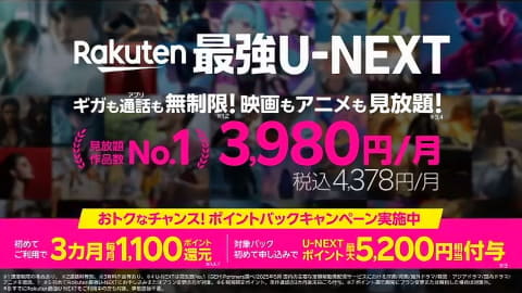 春の新生活向けキャンペーンは、「エンタメ」「預金」「Wi-Fi」「話題のスマホ」の4つで展開する。「エンタメ」では、「Rakuten最強U-NEXT」(月額4,378円)で3月から新キャンペーンをスタート。初めて契約するユーザーには3カ月間、月に1,100ポイントを還元するほか、サッカーパックかワールドゴルフパックを契約する場合はそれぞれ初月にU-NEXTの2,600ポイントを付与する。