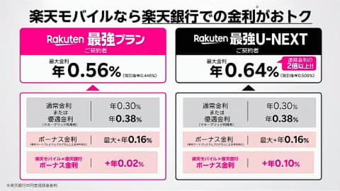 「預金」は、楽天銀行と連携し、金利がアップした円普通預金を利用できる「最強預金」で、すでに発表している内容。優遇金利や対象サービスを利用することによるボーナス金利を含め、Rakuten最強プランでは最大で年0.56%、Rakuten最強U-NEXTでは最大で年0.64%になる。