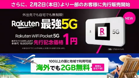 「Wi-Fi」では、5Gとプラチナバンド対応の新型モバイルWi-Fiルーター「Rakuten WiFi Pocket 5G」を3月に発売する。「外出でも自宅でも5Gが無制限」と謳う。同時接続台数は24台に拡大している。本体価格は16,800円だが、2月2日からの一部の先行販売では1円で販売する。海外の100カ国・地域でも2GBまでは無料で利用できる。