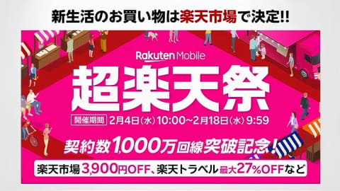 このほか、2025年末で楽天モバイルの契約数が1,000万回線を突破したことを記念した「超楽天祭」を2月4日~18日に開催。楽天モバイルのユーザーは、楽天市場や楽天トラベルなどで割引やクーポンなどさまざまな特典を利用できる。