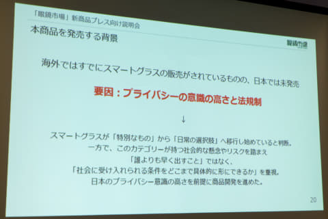 また、販売をオンラインショップで行なわない理由についても、通常のメガネとは異なり、利用時の注意点や禁止事項を購入者に直接説明し、理解を得たうえで販売できる環境を優先したためとしている。