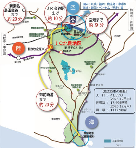 所在地は静岡県牧之原市東萩間地内。国道473号沿いに位置し、東名高速 相良牧之原ICから約300mと広域物流の中継物流拠点としての利便性を備えている。また、国際空港の富士山静岡空港から約8km(車で約9分)、御前崎港から約20km(車で約20分)で、陸・海・空路の物流インフラによる海外輸送にも対応できる。あわせて、国内外の来訪者もアクセスが容易なため、多面的な価値創出が期待できるとしている。
