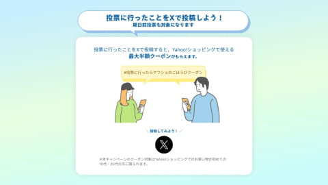 若年層が投票に行くきっかけづくりが目的の施策で、2025年7月の参議院選挙に続く第2弾として、最大半額クーポンを配布する。対象は、クーポン獲得時点で直近1年間にYahoo!ショッピングを利用していない、選挙に投票した10代から20代のユーザー。