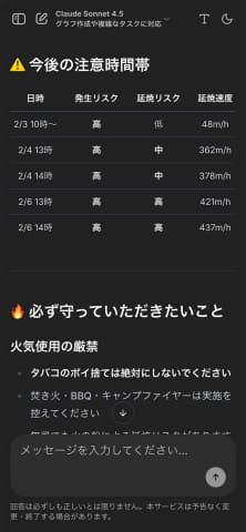 林野火災危険度予測は、ウェザーニューズ社が自治体や消防向けに提供している気象解析データを活用し、ユーザーの現在地や指定した場所における林野火災のリスクを自然言語で即座に回答するもの。