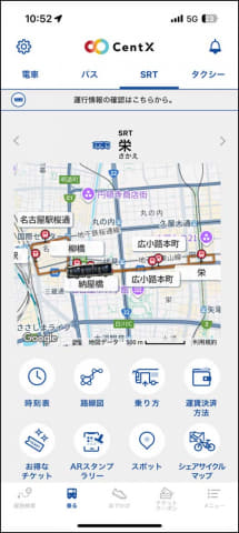 CentXアプリでは、マイSRT機能を新たに搭載。「マイ駅・マイバス停」機能と同様にSRTの停留所を登録することで、SRTに関連する各種情報へスムーズにアクセスできるほか、SRTの走行位置をリアルタイムで確認できる。サービス開始予定日は2月10日。