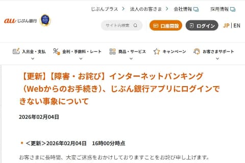 auじぶん銀行で、3日夜からシステム障害などが発生し、インターネットバンキングやアプリなどが利用できない状態となった。4日15時15分ごろには概ね復旧、アプリ等のログインや操作などが可能となったが、4日18時時点でもシステムの正常稼働を「確認中」としている。