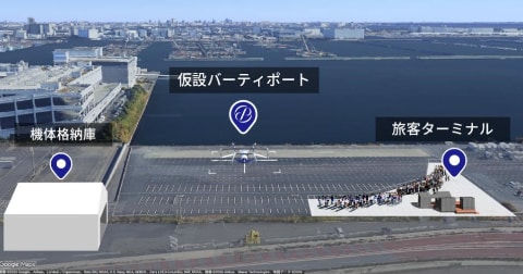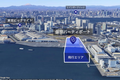 実証では、SkyDriveが開発した国産機「SKYDRIVE(SkyDrive式SD-05型)」を使用。パイロットは搭乗せず、リモート操縦と自動制御によるデモフライトを行なう。飛行ルートは、ビッグサイト駐車場から海上を周回する。
