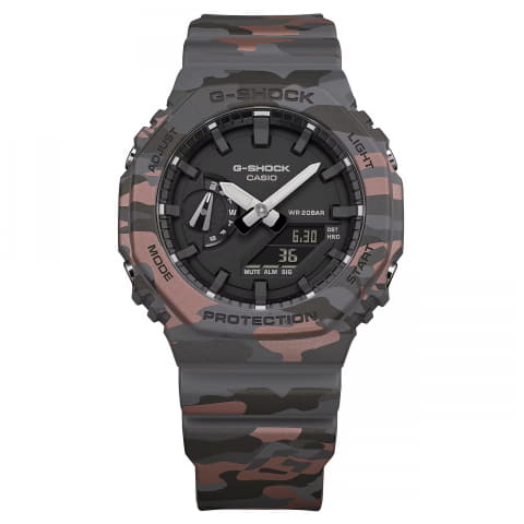 「GA-2100CMD-8AJF」はダイヤル部分にも蒸着処理でカモフラージュ柄が施され、カモフラージュ感をさらに高めたデザインになっている。