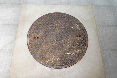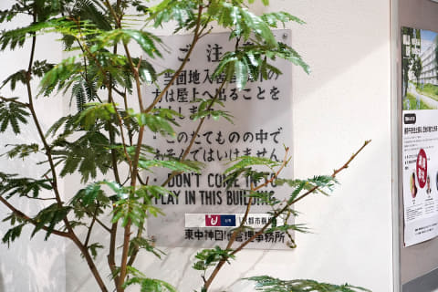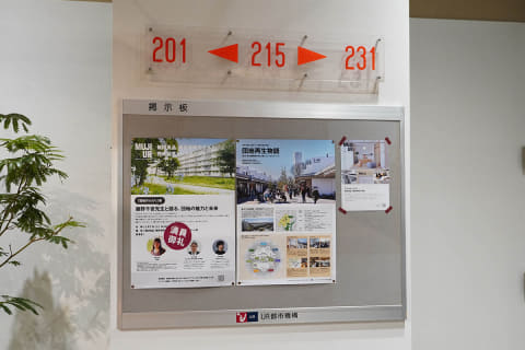 モデルルームでは住戸だけではなく、共用部についての意見も集めるため、団地屋外ひろばを表現したエリアを設置。屋外に置かれているベンチのほか、団地の掲示板、公団マークマンホール、注意喚起看板、団地の玄関ドア・室名札・牛乳瓶ボックスまで再現した。実際に団地まるごとリノベーションで整備した団地の屋外空間の一部をモデルにしている。