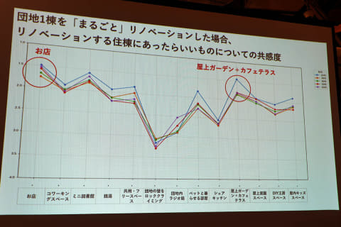 プロジェクトに向けた取り組みとして、1月に「団地にまちをひらく」をテーマとしたWebアンケートを実施。約1,400の回答から、団地に対するイメージやリノベ内容に対する共感度などを可視化した。なおアンケートは「1:非常に共感する」~「3:普通・どちらともいえない」~「5:まったく共感しない」から選ぶ形で、グラフで「1」に近いほど共感度が高くなる。
