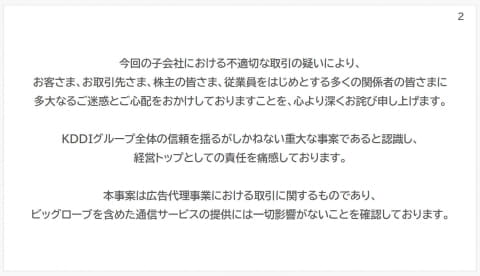 KDDI本体は架空取引に関わっていないとするほか、KDDI・ビッグローブの通信サービスへの影響もないとしている。