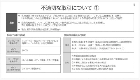 KDDIは2025年10月の時点で、規模が大きくなっていた2社の広告代理事業の管理強化を目的として内部調査を実施していた。この時点で会計監査人から「取引の妥当性」を疑問視する指摘があったものの、客観的な証拠は得られなかったという。ビッグローブを含め、(架空)取引の帳票はすべて揃っており、帳簿上は正当性があったという。