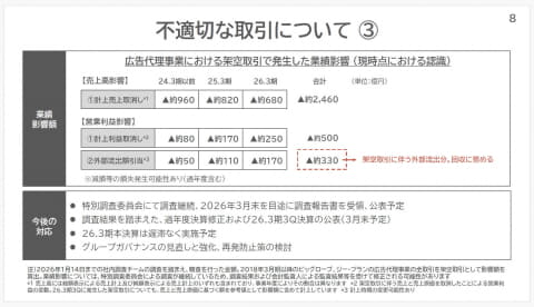 架空取引の過程で手数料として外部に支払われた金額は、回収に努めるとするものの、「外部流出額引当」として合計で最大約330億円の損失計上を見込む。この内訳は、2024年3月期以前の合計が約50億円、2025年3月期が約110億円、2026年3月期の第3四半期までが約170億円と推定しており、期中である2026年3月期の決算では第3四半期に約170億円が損失計上されることになる。