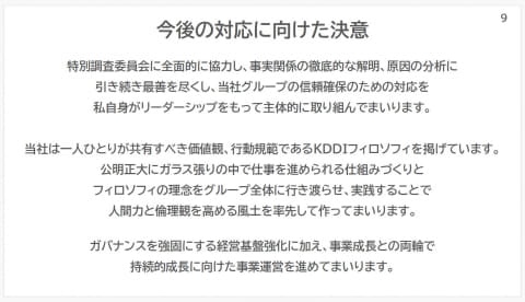KDDIの松田社長は、説明会の冒頭に陳謝。グループ全体の信頼性を揺るがす事態とし、「再発防止とガバナンス強化に努め、強固な経営基盤にすることで責任を果たしていく」と決意を述べている。