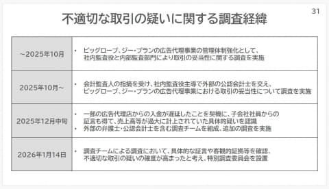 2026年1月14日、調査チームが具体的な証言や客観的証拠を得て、架空取引の疑いが高まったことから、特別調査委員会が設置された。