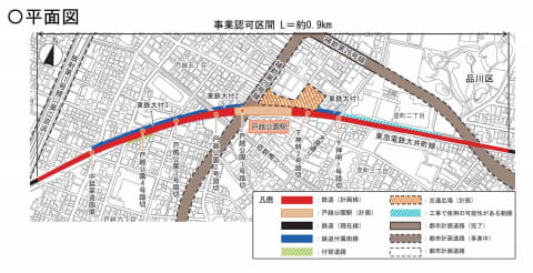 施工箇所は、品川区豊町二丁目~同区戸越六丁目。事業期間は令和17年度(2035年度)までで、事業費は427億円。立体交差化とともに、高架に沿って側道(鉄道付属街路)を約0.3km整備する。