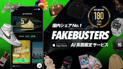 フェイクバスターズは、偽造品の流通が多い約300ブランドを対象とし、累計鑑定数は180万件を超えるAI真贋鑑定サービス。AIによる判定に加え、鑑定チームの知見や専門機器も組み合わせて正確性や迅速性を担保する。国内ではメルカリやラクマ、BOOKOFFなどで導入されている。