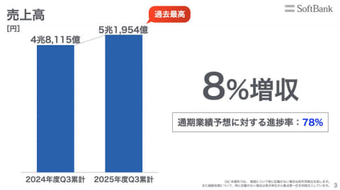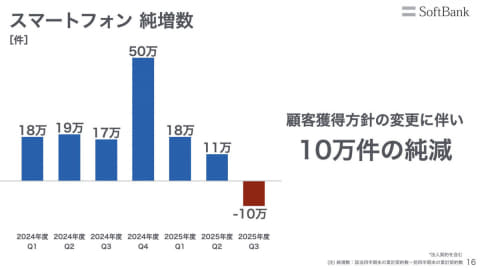 ソフトバンクは2025年度第3四半期決算説明会で、全体としては増収増益を達成した一方、直近3カ月間の携帯電話契約数が約10万件の純減となったことを明らかにした。携帯契約数の減少が公表されるのは同社としては異例だが、会社側は「意図的な構造改革の結果」と説明している。