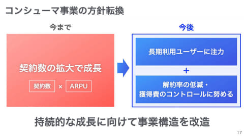 今後については、解約率の低下と1契約あたりの収益改善を進めることで、安定的な利益成長を実現する事業構造への転換を目指すとしている。