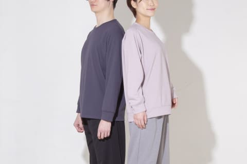ラインナップは、メンズの「VネックTシャツ」(半袖)が1,490円、メンズ・レディスの「長袖Tシャツ」と「ルームパンツ」(ロング丈)が各1,990円。サイズはM、L、LLで、カラーはグレー、ブラック、ネイビーなどを用意する。