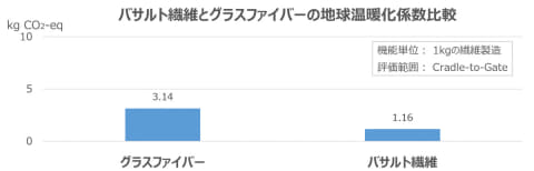 バサルト繊維は、天然素材である玄武岩100%から製造される素材。製造段階で環境負荷の高い化学物質を一切添加せず、有毒ガスや有害物質を排出しない。多くの学術研究によるLCA調査によると、製造段階での地球温暖化係数を従来素材と比較して平均約45%、最大約78%削減できるとされている。