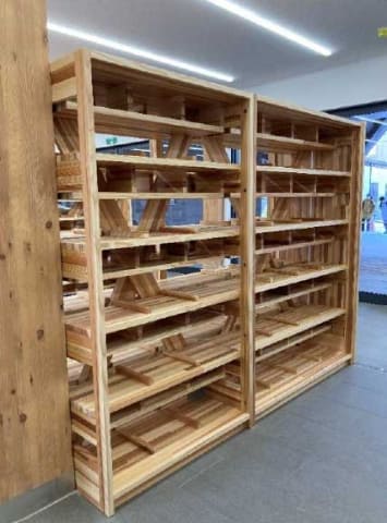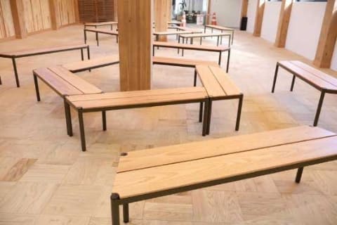 床材・壁材の一部、下足入れ、交流ホールベンチなどには福島県産木材を約16m3使用。県産材の利活用は「福島県森林環境税」の目的に沿った取り組みで、これを財源とした福島市森林環境交付金事業補助金の交付を受けている。