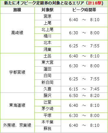 JR東日本は、2026年3月14日に運賃改定を予定しているが、オフピーク定期券については、通勤定期券の約15%割安な価格での販売を継続。対象エリアも拡大して設定する。拡大エリアは、大宮から先の鴻巣、久喜、大船から先の平塚、千葉みなと・千葉から先の蘇我までのエリア。