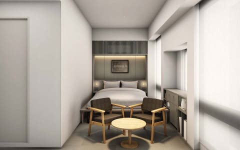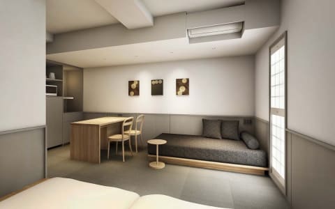 客室は、無印良品の家具やインテリアアイテムを中心に、京都を拠点とするアーティストや京都近郊で活動する作家の作品を取り入れた。シンプルな空間の中に、穏やかで落ち着きのあるしつらえを施し、ゆったりとくつろげる雰囲気を演出。ダブルルーム(2名)、ツインルーム(2~3名)、ツインルーム バスタブ付(3名)、ファミリールーム(4名)を用意する。