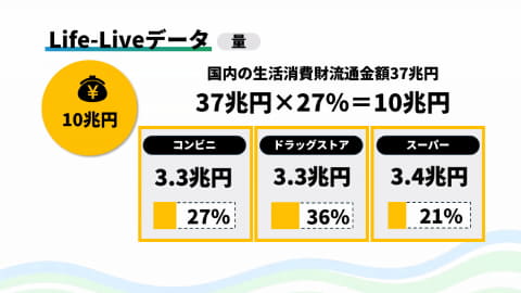 5,500万IDのデータに紐づく食品や日用品といった購買データは年間10兆円規模に上る。これは生活消費財市場の約1/3の規模で、統計上は市場全体を把握できる形という。これらのデータはリアル店舗に紐づいた、日々更新されるダイナミックなデータであることも特徴で、その規模と精緻さから「日本ではオンリーワンの存在」(細見氏)とする。