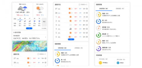 日常から災害発生時までカバー。今日・明日の1時間ごとの天気や週間天気予報、雨雲レーダー、警報や注意報などの情報を確認できる。現在地のほか、任意地点を最大5カ所まで登録でき、その地点の天気予報、警報・注意報などの情報をすぐに確認できる。