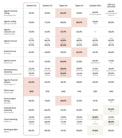 Sonnet 4.6の性能においては、Computer Use以外のあらゆるベンチマークでも性能を向上し、「ほぼOpusレベルの知能」で「実用的な価格帯」を特徴とする。