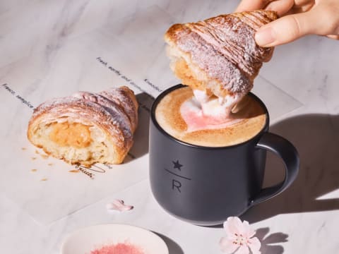 スターバックス リザーブ カフェの1号店は、25年9月に新宿マルイ本館2階にオープン。同店では「クラシック ダブル トール ラテ」にシナモンなど好みのスパイスを加え、コルネッティをディップする「ディップスタイル」体験が好評で、2月27日からは「コルネッティ サクラ」を「クラシック ダブル トール ラテ」にディップする「サクラ ディップ」体験が可能。東京スカイツリータウン30F店でも同メニューを提供する。