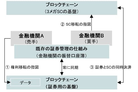 実証実験では具体的に、国債、上場株式、投資信託、社債を対象に、証券会社間取引において、振替口座簿の記録とブロックチェーン上のデータを常に同期させる仕組みが実証される。スマートコントラクトを用いて振替口座簿の記録を更新し、法律上の権利を移転する。これにより、既存金融システムで扱われる伝統的資産をブロックチェーン上で権利移転できることを目指す。