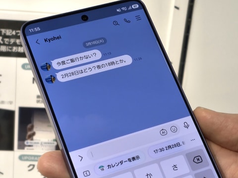 Galaxy S26シリーズは、ユーザーがAIの存在を意識することなく活用できるよう、AIがユーザーの次の操作を「先回り」して提案する。新たに搭載された「Now Nudge(ナウナッジ)」は、AIが画面内に表示された友人とのやり取りなどを理解し、その先に想定される操作をユーザーに提案する。例えば、友人から「2月28日の18時頃にご飯行かない?」とメッセージが届いた場合、Galaxy AIが次に取る行動を提示する(カレンダーを表示する、2月28日の予定を登録するなど)。