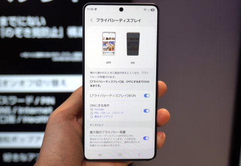 技術面では、有機ELディスプレイの画素制御を活用し、光を拡散させる発光と正面方向へ直進させる発光を切り替えることで、プライバシーモード時は斜め方向からの視認性を抑制。満員電車やエレベーター、オフィスなど周囲の視線が気になる環境でも、画面内容を保護しながらスマートフォンを利用できるとしている。