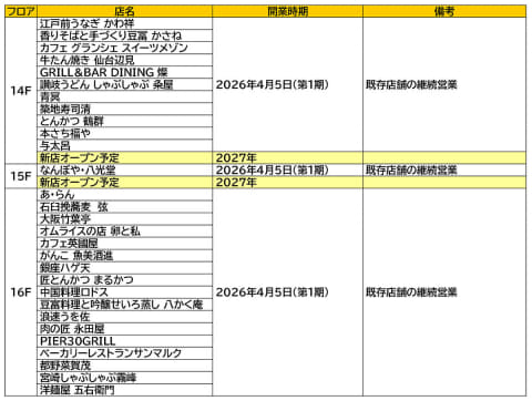 14階~16階には飲食「LUCUA SOUTH DINING」を展開。第1期では「大丸梅田店」「イチロクグルメ」で人気の28店舗が営業を継続し出店する。27年にはファミリー層をターゲットとした新しい飲食店が出店し、計35店舗以上のレストランゾーンとなる。