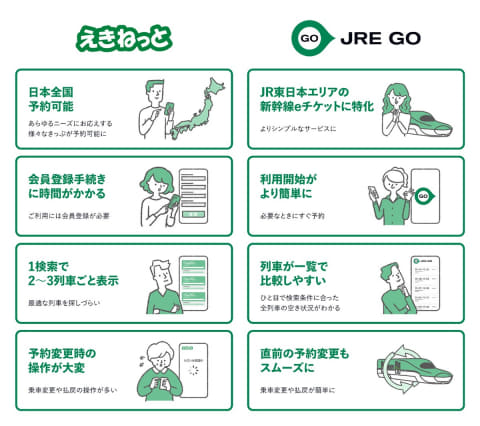 こうした意見に応える形で、新しい予約サービスとしてJRE GOをスタートする。えきねっとのサービスは今後も継続するが、将来的にはJRE GOとえきねっとの一体化を目指す。