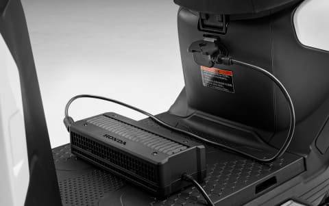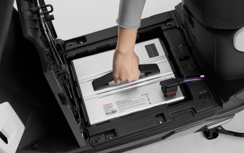 バッテリーとモーターで走行する電動スクーター。着脱式のリチウムイオンバッテリーをフロアステップ下に搭載し、車載・単体の両方の状態で充電できる。外部電源(100V)での充電時間は、ゼロから満充電まで約8時間。バッテリーの容量は48V・30.6Ah。効率的な制御により、一充電あたりの走行距離は81km(30km/h定地走行テスト値)を実現している。