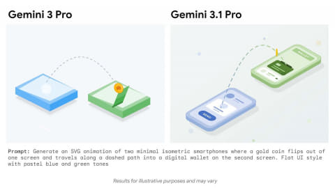 Googleによる発表では、3 Proと3.1 Proの比較として、アニメーションSVG(コード)の生成品質の高さの比較を紹介しているほか、インタラクティブなデザイン、複雑なシステム統合などの能力をアピールしている。