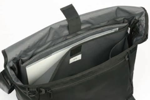 バッグを座席下に吊るした後は、付属のクッションマットを座面に敷き、その上に腰掛ける。クッションマットは座布団として使えるほか、通常時はPCスリーブのクッション材としても活用可能。