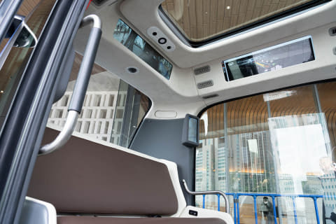 「RoboBus」(ピクセルインテリジェンス)は6人乗りの電気自動車。レベル4の公道自動運転を目指しています。現在はオペレーターが同乗しますが、会場では自動運転による走行が体験できます。