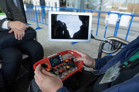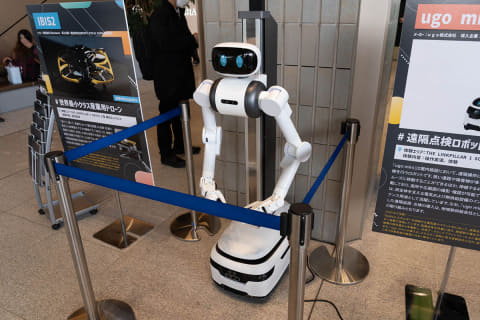 「ugo mini」(ugo)は遠隔点検ロボット。熱供給設備の点検で使われています。伸縮するアームに付いたカメラで確認作業ができます。