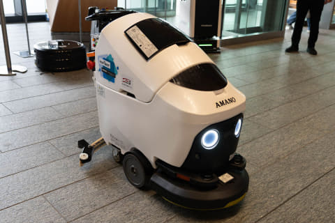 「HAPiiBOT」(アマノ)はウエット式の清掃ロボット。石材などの床を自動で効率よく洗浄できるマシン。大規模施設に向くそうです。