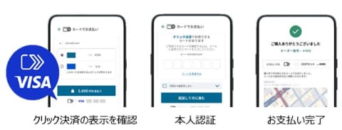 オンライン加盟店の購入手続きページに「クリック決済」のアイコンが表示されていれば、Visaでクリック決済が可能。メールアドレスもしくは電話番号で本人認証を行なうと、クリック決済に登録されているカードが表示され、素早く支払い完了できる。