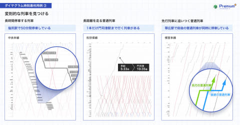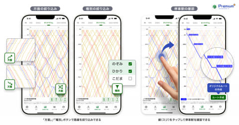 「ダイヤグラム時刻表」は、縦軸に駅名、横軸に時間をとり、列車の運行を線(スジ)で表現したダイヤグラム形式で時刻表を表示する機能。列車の運行本数・停車時間の長さ・列車同士の追い抜きや行き違いなどの情報を視覚的に確認できる。