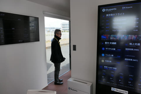 チェックインが完了し、金属探知で保安検査をすませると、隣のエリアに入れるようになる。ここでは空飛ぶクルマと連携する他のモビリティの運行状況、近隣の交通状況なども提示されている。同時に離発着情報なども提示されている。安全ビデオの空飛ぶクルマバージョン映像なども表示される予定だという。