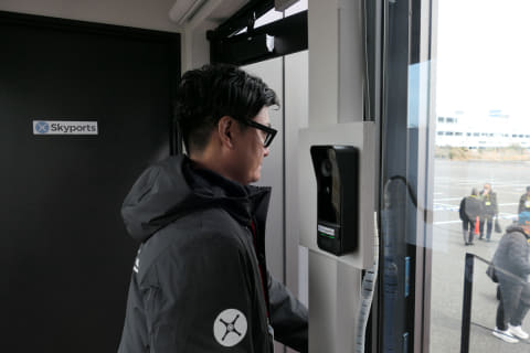 搭乗時間が迫ってくると、実際のチェックインに進む。チェックインは顔認証システムを使う。体重計も設置されており、認証と同時に体重も測って、機体のバランスを見る。ちなみに今回は使えないが、トイレも設置されていた。オフグリッドでも動くように水循環システムも設けられている。