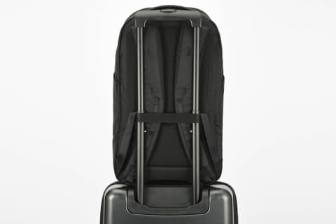出張や旅行時の使い勝手を考慮し、スーツケースのプルドライブハンドルに固定できるセットアップ機能を搭載。走行時のバッグのふらつきを防げる。