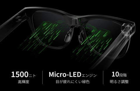 両レンズ上に情報を重ねて表示するデュアルディスプレイ(Micro LED Green ディスプレイ)を搭載。解像度は680×480ドット、最大輝度は1,500nitで高い視認性を実現する。