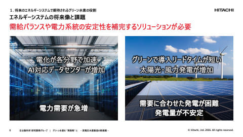 AI需要の急激な拡大やグリーントランスフォーメーションの拡大により、電力需要は急増している。リードタイムが短い太陽光や風力発電が増加している一方、それらの発電量は不安定であり、系統安定においては新たな課題が発生している。再生可能エネルギーを大量に導入すると電力系統の需給バランスが崩れがちであり、エネルギーシステムの将来像を考えると、需給バランスや電力系統の安定性を補完するソリューションが必要だ。
